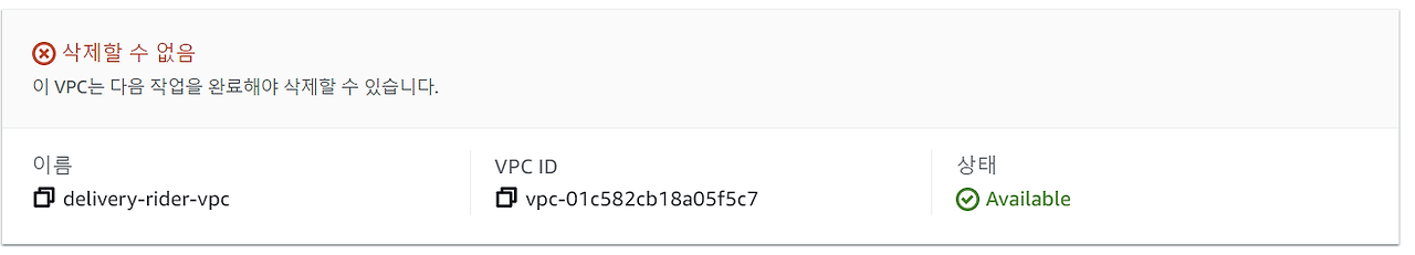 현재 문제는 VPC link에 있다. VPC 링크는 API gateway와 VPC를 이어주는 매개의 역할을 하므로 특정 VPC를 쳐다보게 되어있다. 그래서 VPC를 삭제하려고 하면 경고가 뜨면서 삭제되지 못하도록 해놓은 것이다.