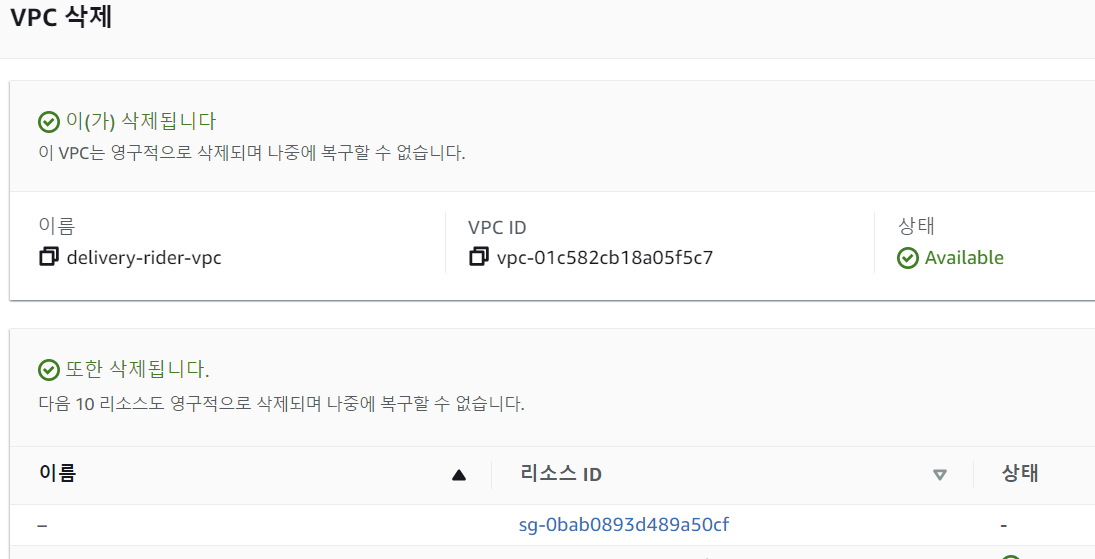 이 VPC link를 삭제하고 나서 다시 VPC 삭제를 시도해보자. 정상적으로 삭제되는 것을 확인할 수 있다.