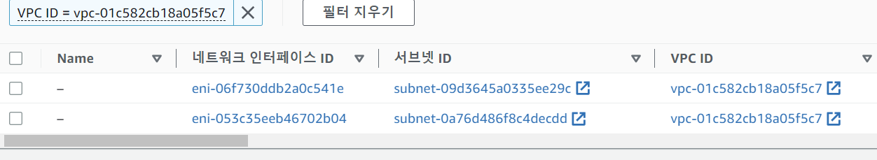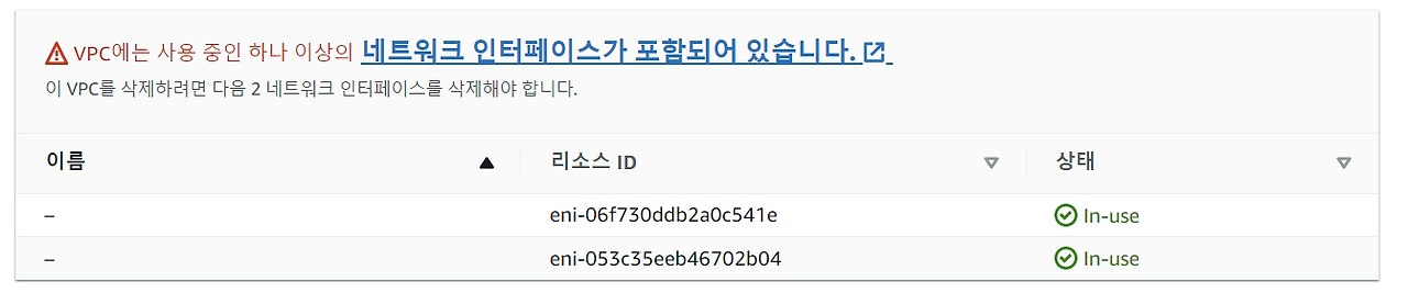 '네트워크 인터페이스가 포함되어 있습니다.' 를 클릭하면 현재 삭제되지 않는 VPC에 관련된 ENI 리스트가 뜨게 된다.