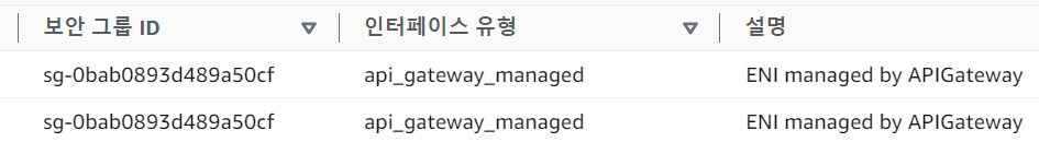 리스트를 오른쪽으로 쭉 드래그해보면 해당 ENI의 유형과 설명이 적혀있다. 현재 설명에서 ENI managed by APIGateway라고 적혀있다. 즉, 이 ENI는 API gateway에 의해 관리되고 있는 요소라는 것이다.