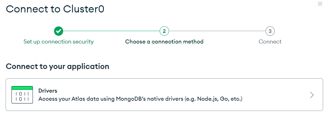 atlas 클러스터에 connect를 누르고 Drivers를 선택하여 DB 연결에 url을 가져온다.