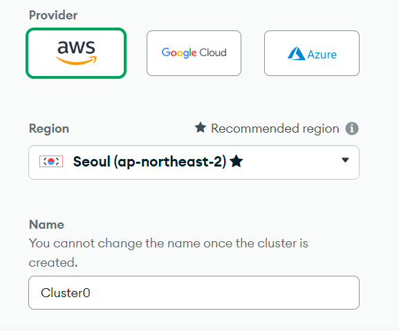 provider는 aws를 선택하고 region은 seoul을 선택하면 된다. create을 누르면 DB가 생성된다. 클러스터와 샤드도 자동으로 생성된다.