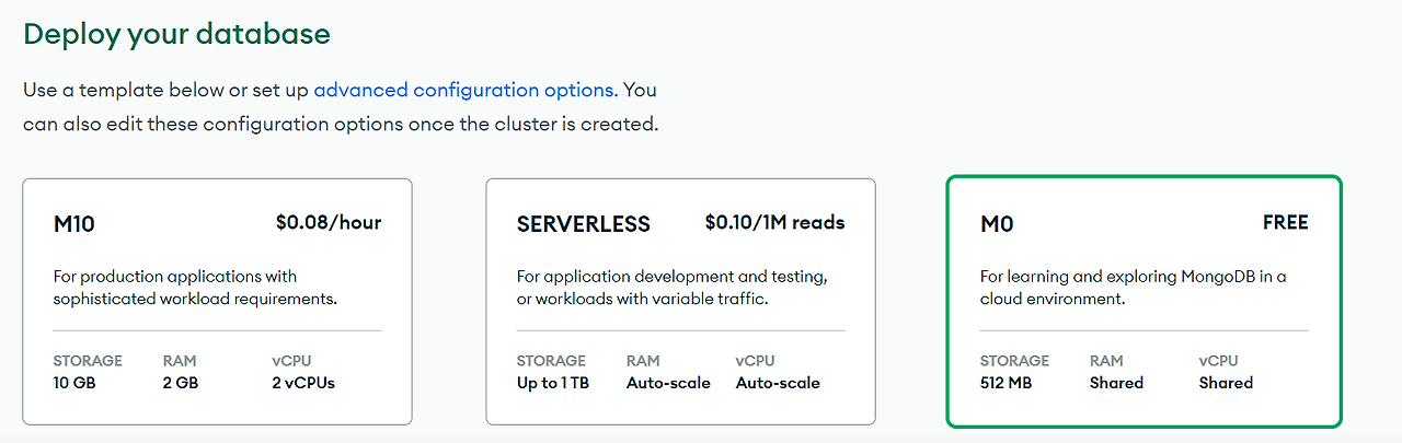 DB 타입은 M0을 사용해야 무료로 사용할 수 있다. 다른 타입의 DB를 선택하면 비용을 지불해야한다.