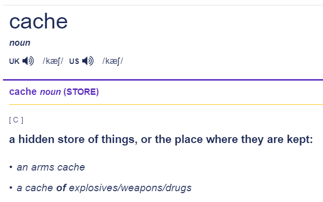 Cambridge dictionary에 "cache"를 검색하면 아래와 같이 나온다.