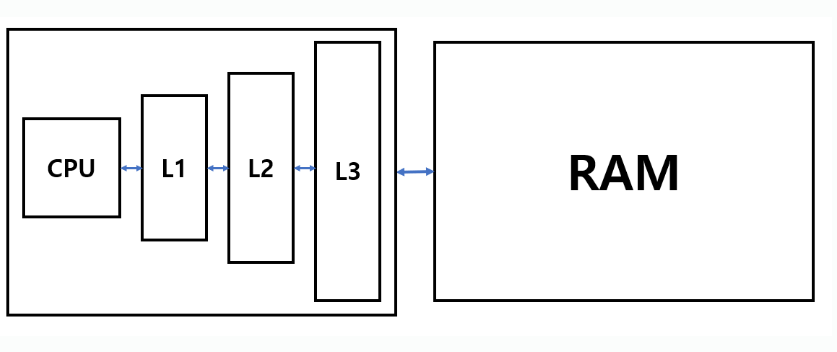 이 Cache에서 데이터 참조 속도는 CPU Register보다는 느리지만, RAM보다는 빠르다. CPU의 캐시에는 L1, L2, L3가 존재하며 여기서 'L'은 '레벨'을 의미한다. L1이 가장 빠르고 그 다음으로 L2가 빠르며, L3가 가장 느린 캐시다. CPU에서 데이터가 필요하면 L1을 먼저 참조하고, L1에 데이터가 없으면 L2를 참조, L2에도 데이터가 없으면 L3를 보는 식이다. 모든 캐시에 데이터가 없으면 그제서야 RAM을 들여다봐서 데이터를 가져온다. 즉, 여기서 Cache는 CPU가 RAM을 보기 전 중간 징검다리 역할을 하는 것이다. 만약 이 징검다리에서 원하는 데이터가 있다면, RAM까지 데이터를 탐색하지 않고 그대로 CPU에서 그 데이터를 활용하여 RAM 탐색하는 시간을 절약할 수 있다.