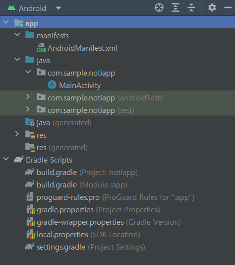 프로젝트 생성이 완료되면 아래와 같이 MainActivity와 Manifest가 자동적으로 생성되어있을 것이다.