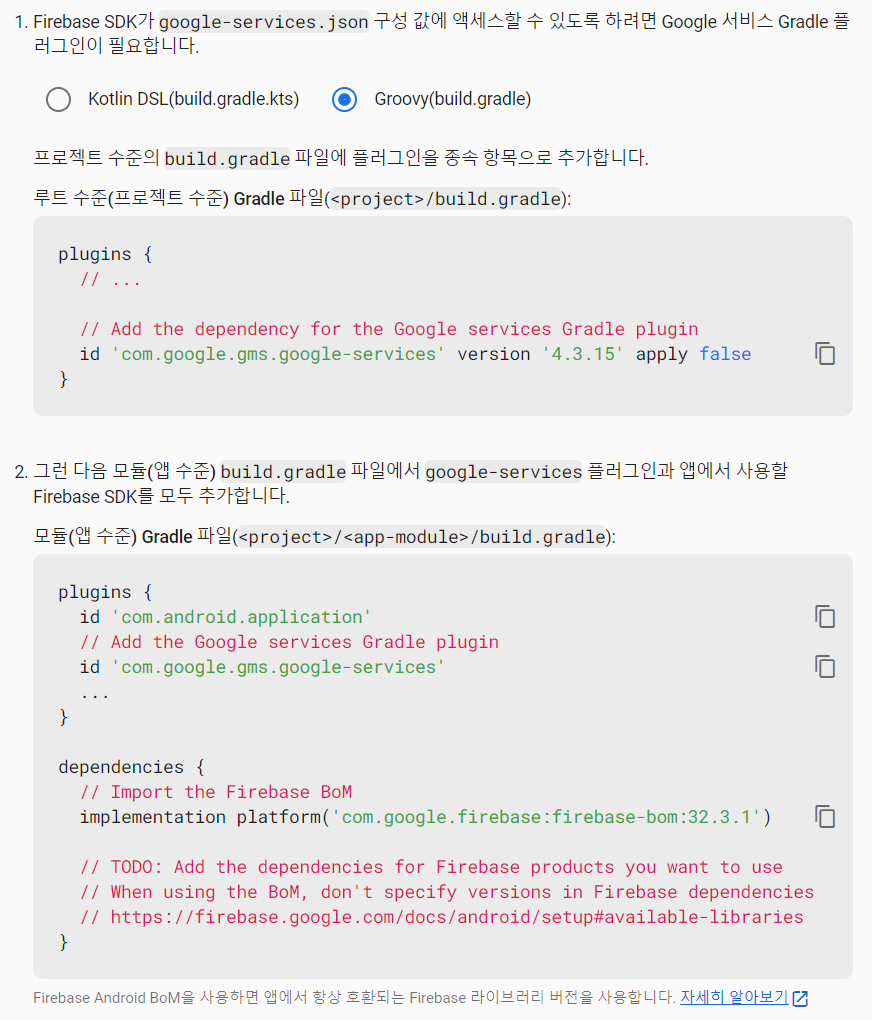 Firebase SDK 추가 부분은 일단 넘어가고 설정을 완료한다.