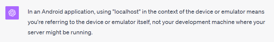 이처럼 Android 앱에서 작성된 코드의 localhost는 당연히 디바이스 내부 통신을 가리키는 것이라서 서버에 접근하려면 localhost가 아닌 서버의 ip에 데이터를 전송해야한다.