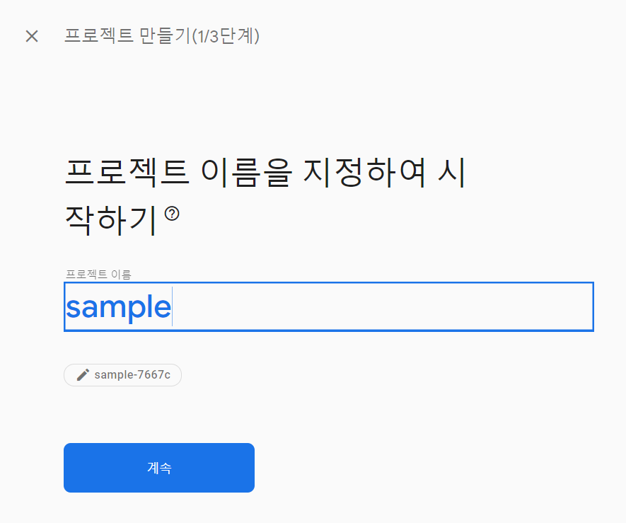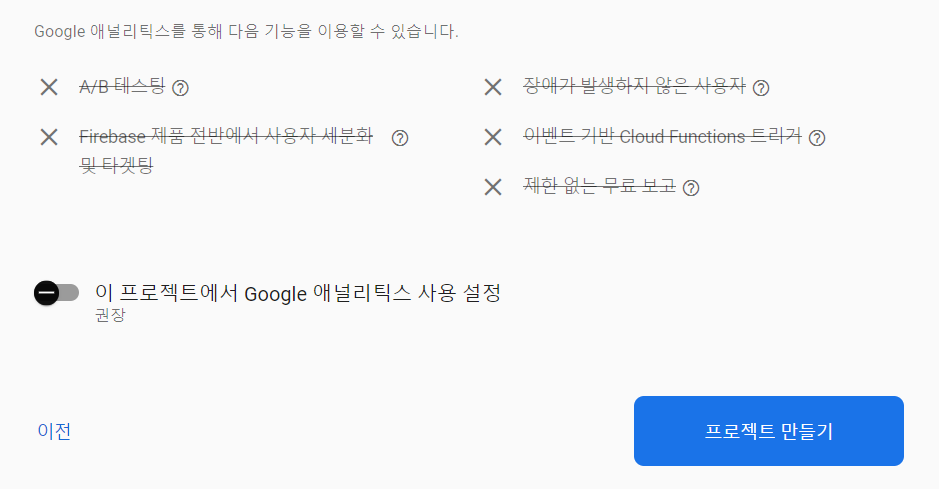 테스트 용도로 만드는 프로젝트기 때문에 구글 애널리틱스는 끄고 프로젝트 만들기 실행