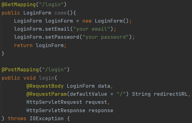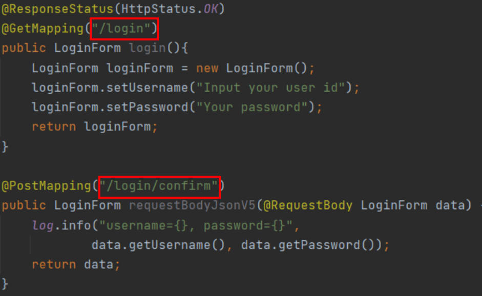 서론에 서술했듯이 똑같이 "/login" URL을 사용하여 컨트롤러을 매핑해도 annotation에 기록된 method가 다르면 다른 API로 인식되어 동작한다. 그러므로 @GetMapping과 @PostMapping은 아래처럼 동일한 URL을 가질수 있다.