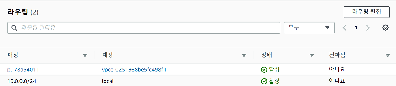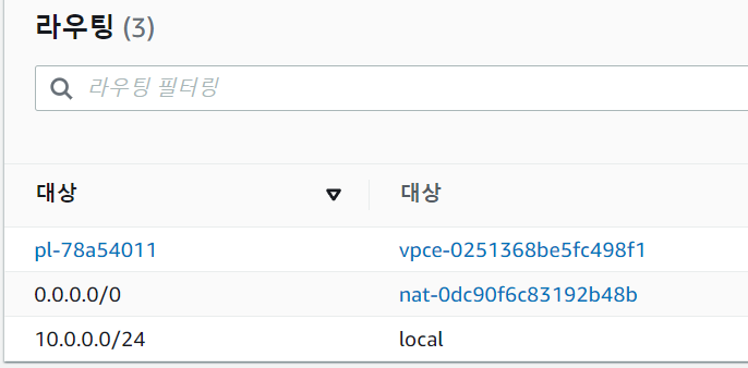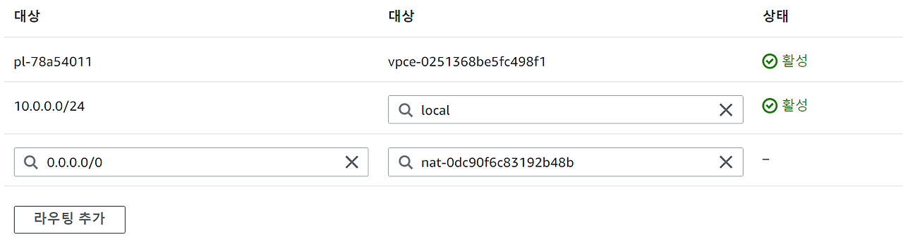 2. 이미 라우팅 테이블에 몇몇 IP 대상이 등록되어있을 것이다. local은 local로 보낼 용도의 ip이고, 기본적으로 모든 라우팅 테이블에 존재한다. vpce는 vpc endpoint를 의미한다.