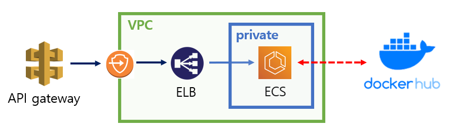 프로젝트 진행 중에 AWS ECS가 생성되지 않는 문제가 발생했다. 현재 프로젝트 설계 구조는 다음과 같이 VPC 내 프라이빗 리소스를 통해 API gateway - Load balancer - Container Service 가 연결되어있는 구조다.