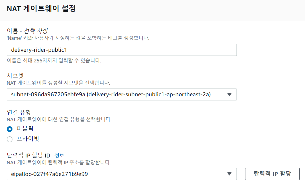 4. 이름을 채우고, 서브넷을 연결한다. 서브넷은 해당 서비스가 올라갈 **'Public subnet'** 을 선택해야한다. '탄력적 IP 할당'을 눌러서 탄력적 IP를 새로 생성하거나, 미리 생성해둔 탄력적 IP를 할당한다.