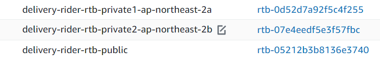 4. '변경사항 저장'을 누르면 방금 등록한 라우팅이 테이블에 존재한다. 이렇게 모든 서브넷 private -> public 연결을 해준다.