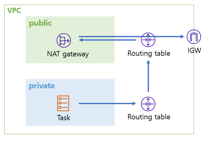그럼 private subnet이 아닌 public subnet만을 사용해서 ECS를 구동해야하는가? 설계 구조를 바꿔야 하나? 그렇지 않다. Private subnet에 있는 ECS에서 외부 인터넷으로 요청을 보내려면 NAT gateway를 public subnet에 설치하고 ECS의 모든 요청을 public subnet으로 라우팅 시키면 된다. 자세한 내용은 본론을 살펴보자.