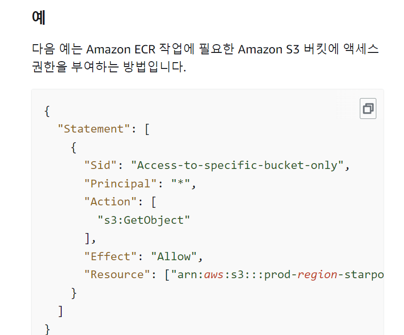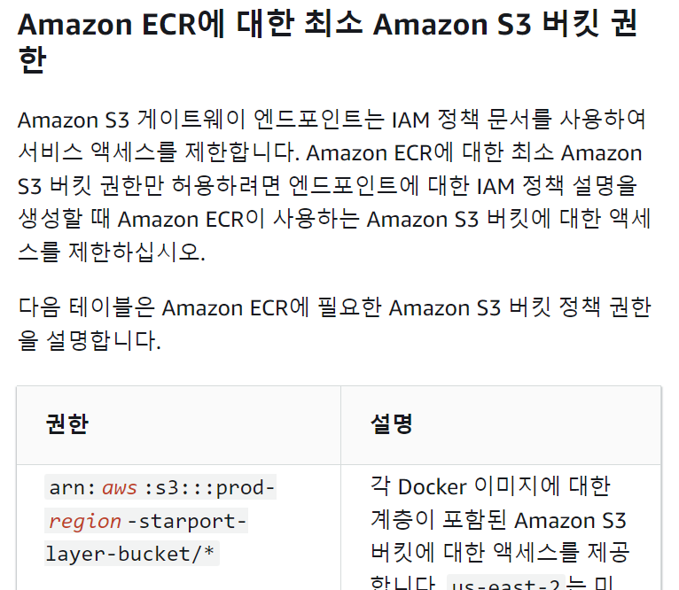 여기서 추가적으로 주의해야할 사항은 ECR 기능을 사용할 사용자가 S3에 다음과 같은 접근 권한을 가지고 있어야 한다는 것이다. AWS 공문서에 나와있는 권한을 참고하여 IAM에서 권한을 추가하도록하자. 만약 S3FullAccess 권한이 있는 사용자라면 해당 내용은 신경쓰지 않아도 된다.
