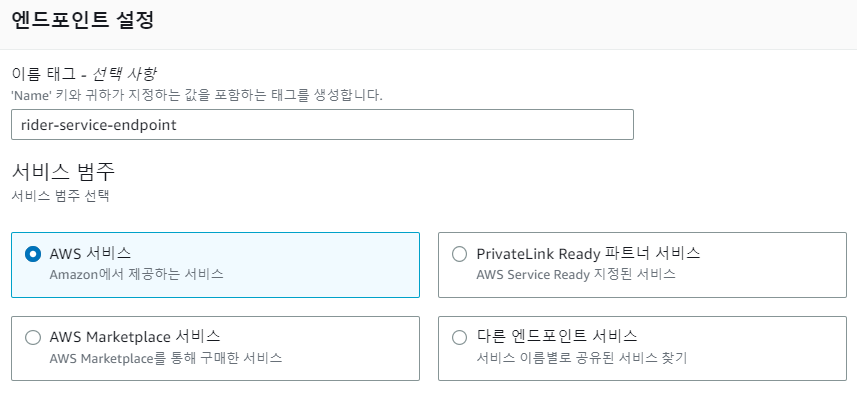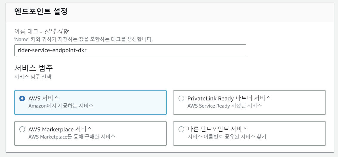 우선 엔드포인트에 사용할 이름을 임의로 입력하고, 서비스 범주는 AWS 서비스를 선택한다 (ECR은 AWS 서비스니까)