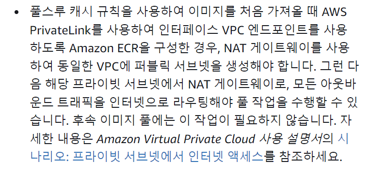 즉, ECR에서 private link를 통해 이미지를 가져오려면 NAT gateway도 있어야 한다는 말이다. 후속 이미지 pull에는 NAT gateway가 필요없지만, Image를 업데이트하여 push를 한다면 NAT gatway 설정이 필요한 것이다. (이럴거면 그냥 차라리 Docker Hub에 이미지 쌓아두고 NAT gateway만 쓰는게 낫지 않나 싶다.)