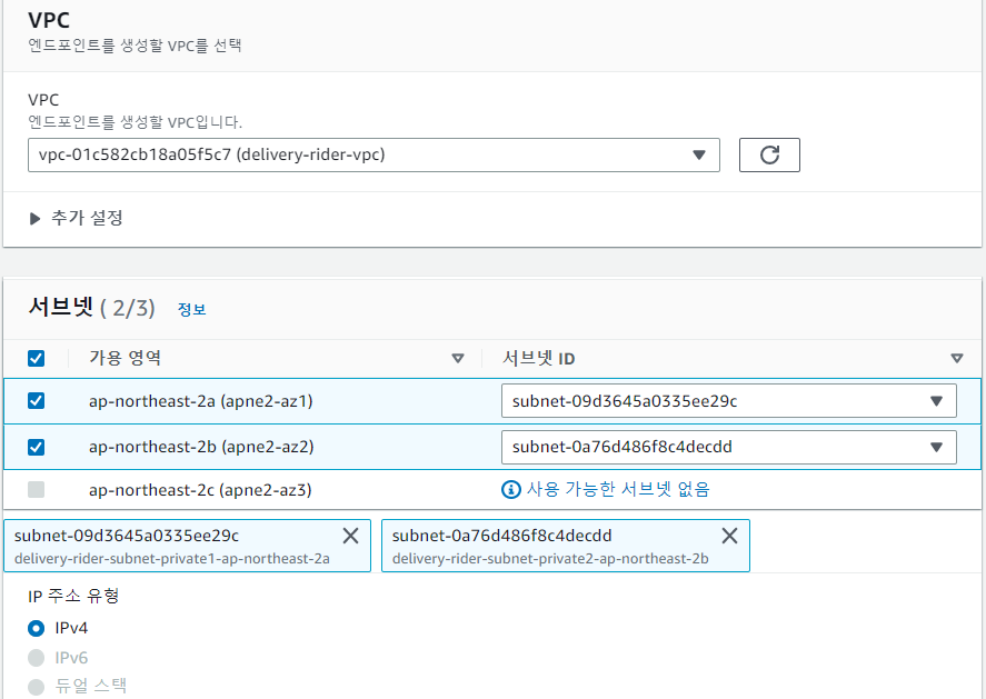 엔드포인트를 연결할 VPC를 지정하고 서브넷까지 선택해준다. VPC 엔드포인트는 가용영역 별로 요금이 부과된다. VPC 엔드포인트를 사용할 가용영역을 지정하여 서브넷을 연결한다.