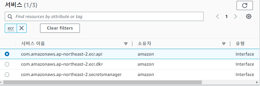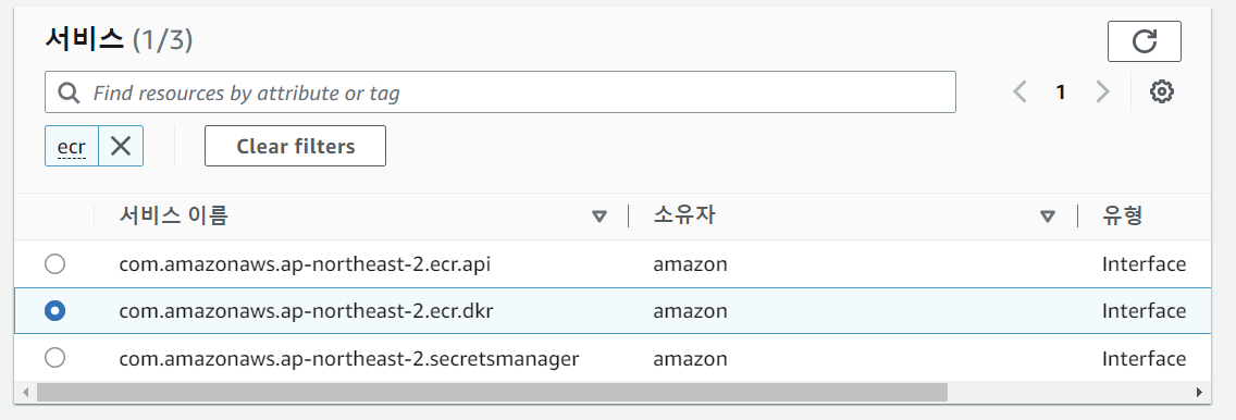 아래 서비스에서 ecr을 검색하면 ecr.api 그리고 ecr.dkr 두 가지 서비스가 나온다.