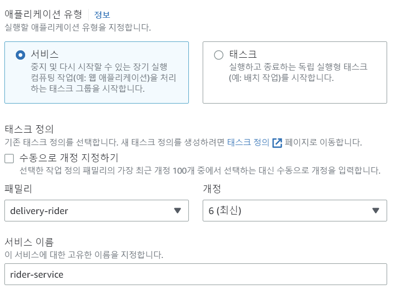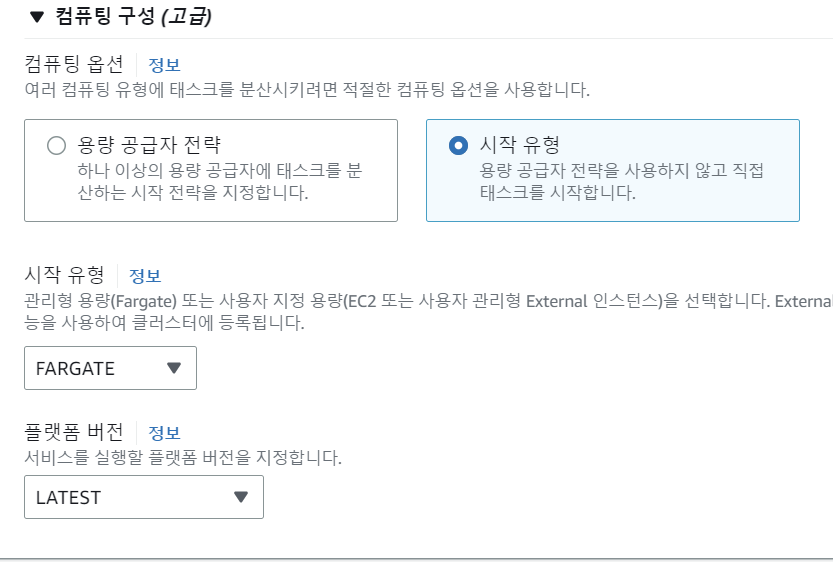 AWS ECS 서비스로 넘어와 클러스터를 선택하여 서비스를 생성한다. 컴퓨팅 구성은 시작유형의 FARGATE를 선택하고 버전은 LATEST로 지정하고, 배포 구성은 서비스를 선택하여 미리 작성해둔 태스크 정의를 선택하고, 이름은 임의로 지정한다. 태스크 수는 테스트 용도이므로 하나만 생성한다.