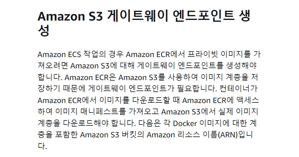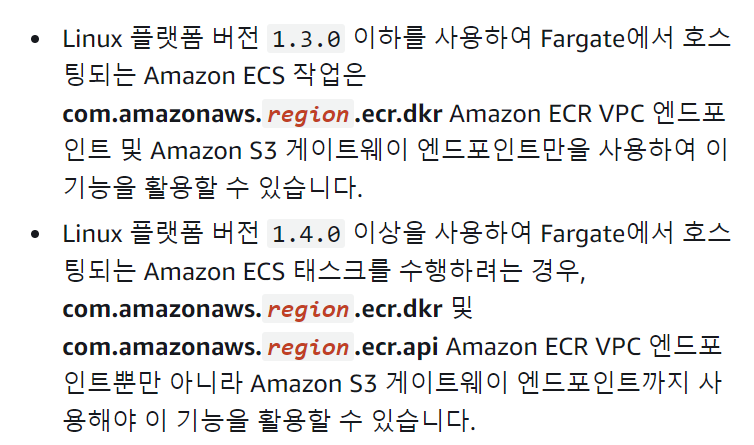 즉, Task 배포에 사용하는 컴퓨팅 서비스가 Fargate 1.3.0 이하면 ecr.dkr 인터페이스 엔드포인트와 S3 게이트웨이 엔드포인트 이렇게 2개만 있으면 되지만, 배포에 Fargate 1.4.0 이상 버전을 사용한다면 ecr.dkr, ecr.api, S3 게이트웨이 엔드포인트 이렇게 3개의 엔드포인트가 필요하다는 것이다.