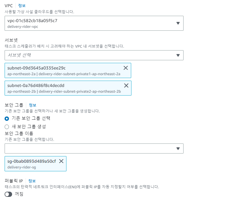 네트워킹 탭에서는 아까 엔드포인트를 생성할 때 선택한 동일한 VPC와 서브넷을 선택하고 보안그룹도 동일하게 지정해줘야 한다. 서브넷은 private subnet만 선택하는 것을 유념해야한다. 퍼블릭 IP는 꺼줘야 한다.