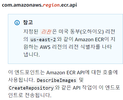 앞서 언급한 대로 ECR 관련 엔드포인트는 ecr.dkr과 ecr.api 두 개 존재한다. 둘 다 생성해야 1.4.0이상 버전에서 사용할 수 있다.