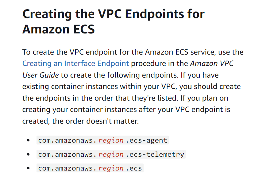 상기한 VPC 엔드포인트를 전부 생성했어도 ECS TASK가 정상적으로 구동되지 않을 수도 있다. 그 원인은 NAT gateway를 생성하지 않아서 그럴 수도 있다. 아래 AWS 공문서 내용을 확인해보자.