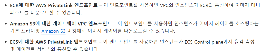 S3 게이트웨이 엔드포인트와 ECS 인터페이스 엔드포인트 3가지는 어느 경우에서나 필요하고, ECR 인터페이스 엔드포인트는 ecr.dkr은 항상 필요하며 Fargate 1.4.0 이상 버전을 사용할 경우 ecr.api 엔드포인트도 필요하다.